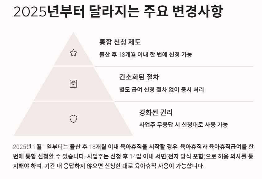 2025년 1월 1일부터 시행되는 가장 큰 변화는 통합 신청 시스템입니다. 출산 후 18개월 이내에 육아휴직을 시작하는 경우, 육아휴직급여와 육아휴직을 한 번에 신청할 수 있게 되었습니다.