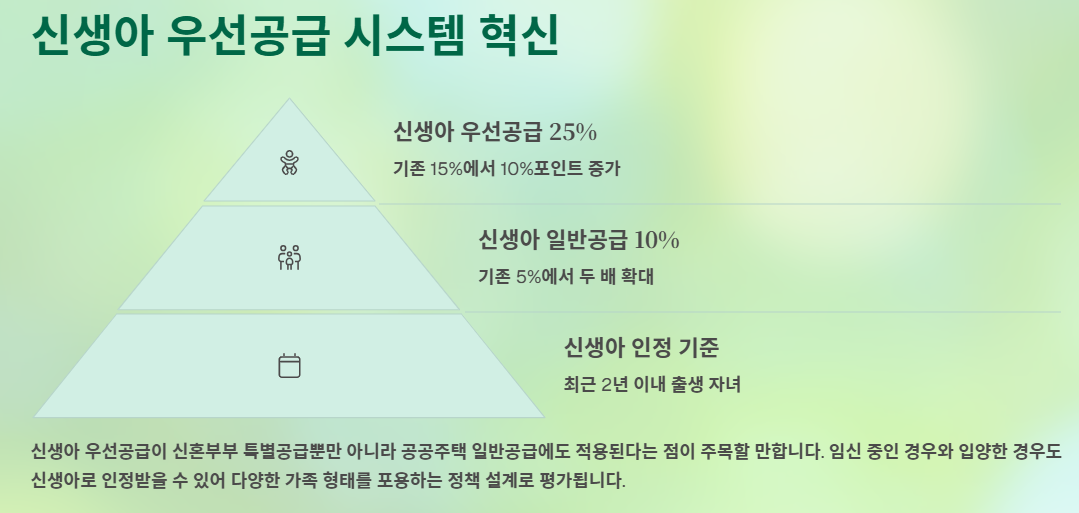 2025년 청약 제도 개편에서 가장 파격적인 변화 중 하나는 신생아 우선공급 비율의 대폭 확대입니다. 신혼부부 특별공급 내에서 신생아 우선공급 비율이 기존 15%에서 25%로 10%포인트 증가했습니다.